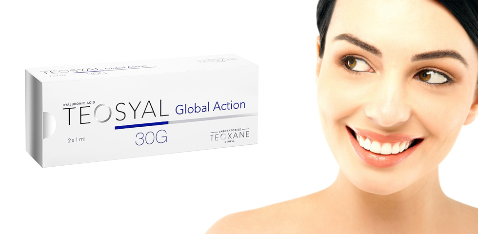 Available syringe size: (30G) 25mg/ml of HA, 2 x 1ml syringes per boxTeosyal Global Action, injected into the mid-dermal layer, suitable for mild-moderate wrinkles, nasolabial lines, glabellarlines, periorbital and perioral areas.